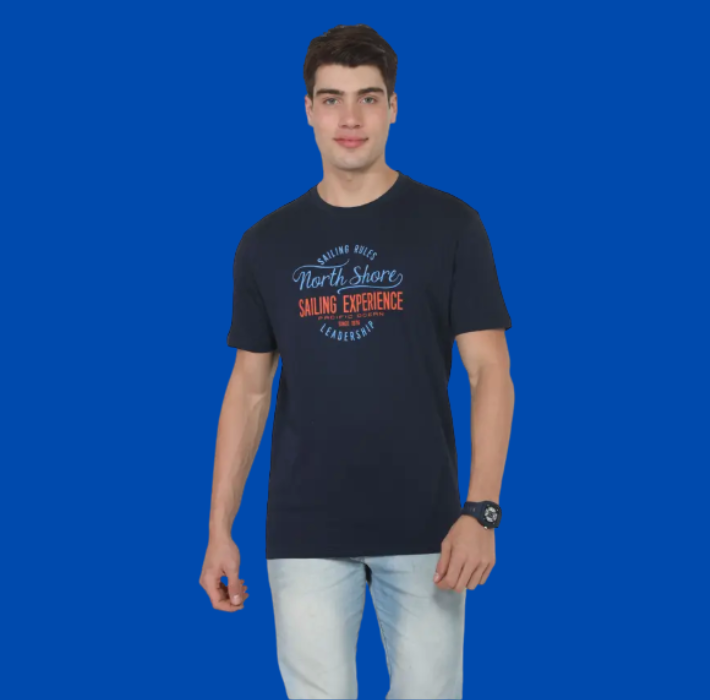 Men Printed Round Neck Pure Cotton Navy Blue T-Shirt