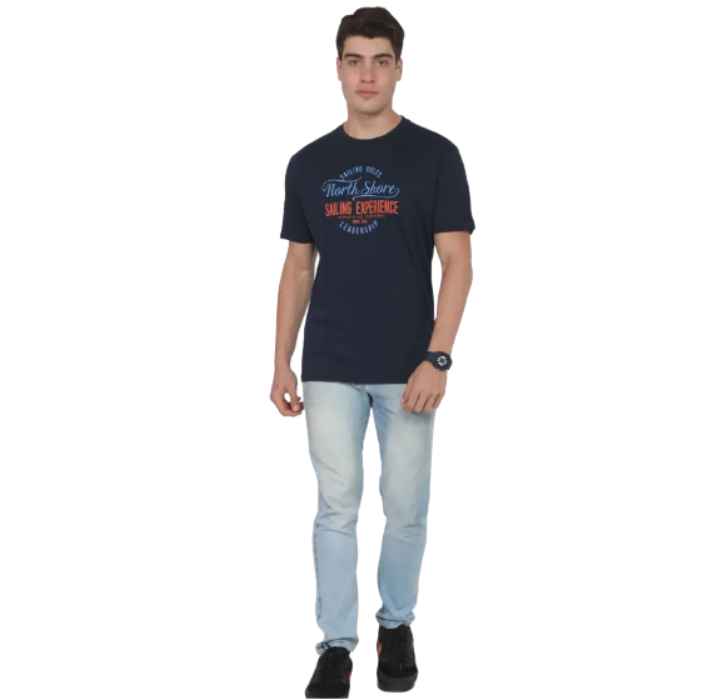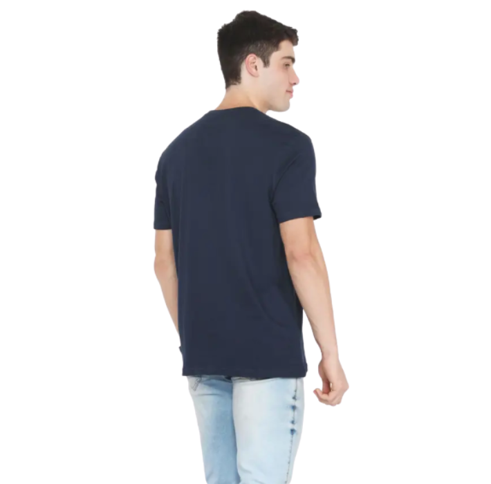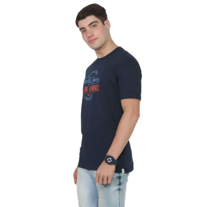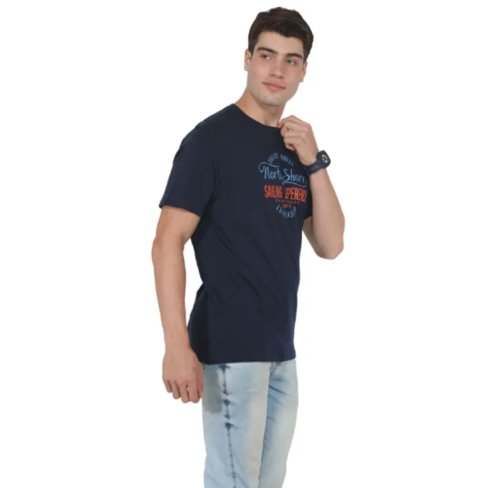 Elevate your casual style with this pure cotton navy blue t-shirt from AFAP, featuring a unique print and a comfortable round neck. Perfect for everyday wear.